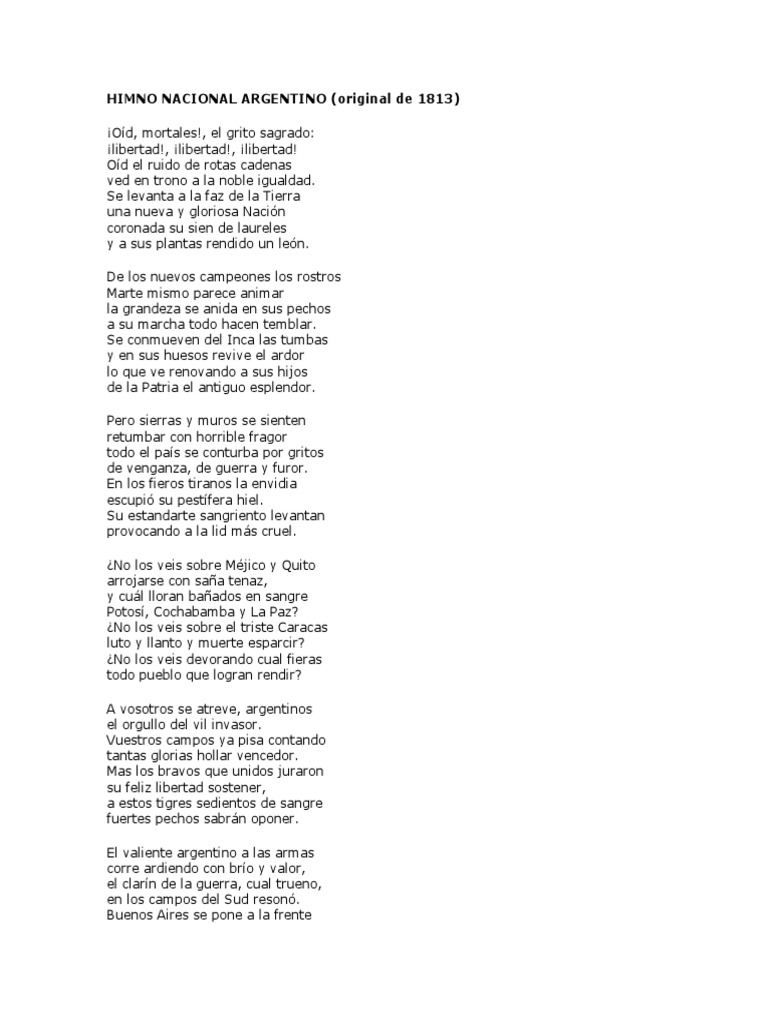¿con que propósito se habrá escrito? Oíd mortales el grito sagrado libertad, libertad, libertad, oíd el ruido de rotas cadenas ved en trono. Te mostramos la versión actual del himno argentino para que los niños puedan practicarla junto con música. La letra del himno nacional estuvo a cargo de vicente lópez y planes y la música fue compuesta por blas parera, quien escribió la himno nacional argentino. ¿qué simboliza o representa para los argentinos el himno nacional?